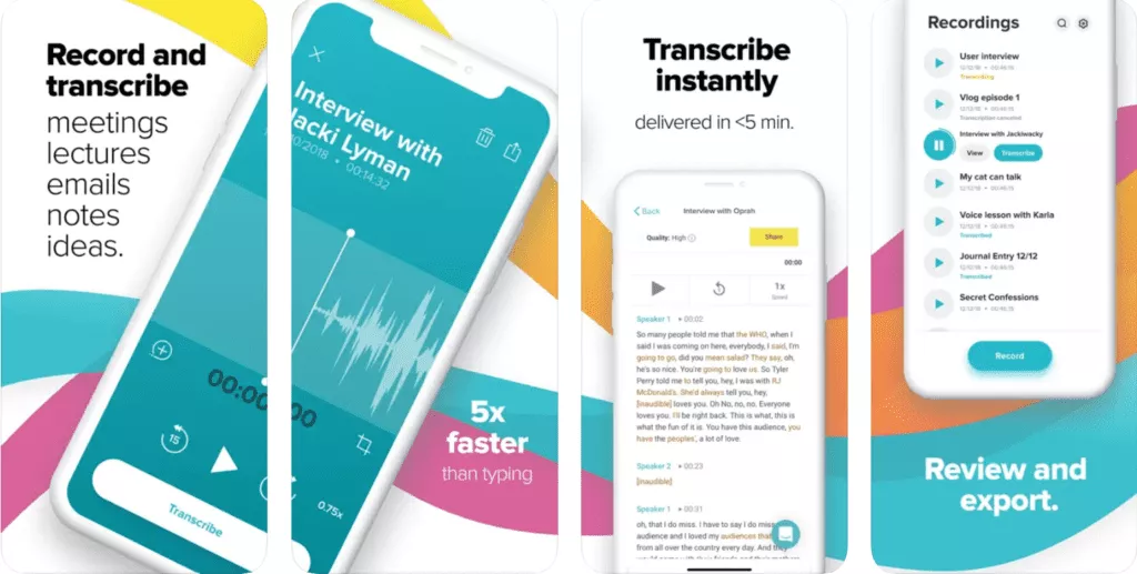 Esta aplicación móvil ofrece servicios de transcripción humana y automática. Utiliza motores de reconocimiento automático de voz que ayudan a transcribir archivos de video y audio o subtítulos generales.
