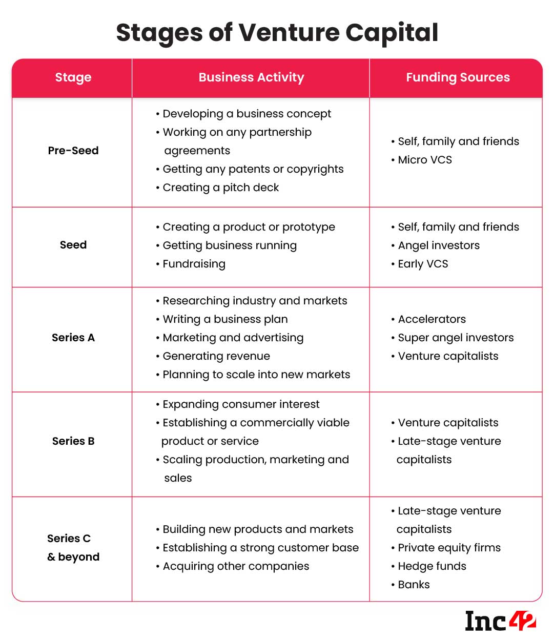 - Serie C: las empresas emergentes en esta etapa tienen una base de clientes considerable en una región geográfica del mundo. Están buscando una expansión en el extranjero y aventurarse en mercados más nuevos. Los fondos recaudados en esta ronda generalmente se utilizan para el mismo propósito. A veces, las nuevas empresas en esta etapa tienden a adquirir nuevas empresas más pequeñas de bajo rendimiento en el mismo segmento. En esta etapa, las inversiones a menudo provienen de fondos de cobertura, bancos de inversión y firmas de capital privado.
