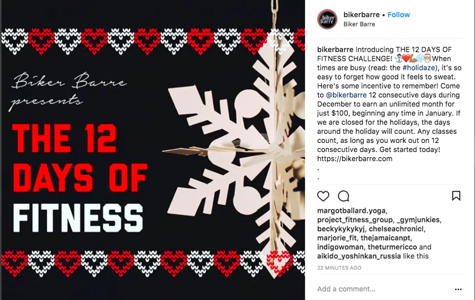 Par exemple, consultez le Fitness Challenge de Bike Barre. S'éloignant d'une campagne de cadeaux typique qui implique de taguer et d'aimer, cette campagne encourage le public à participer physiquement à la place. La société promet un abonnement à prix réduit à toute personne qui s'entraîne au gymnase pendant 12 jours consécutifs, en suivant le thème des 12 jours de vacances.