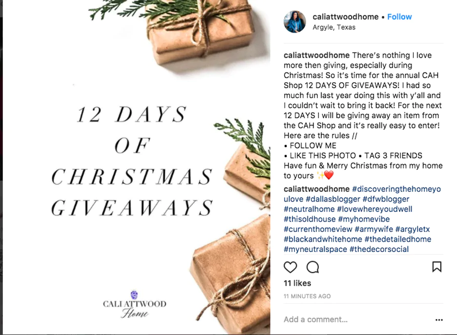 Par exemple, Caliatt Wood Home a organisé une campagne de cadeaux classique sur le thème des 12 jours de Noël. Après avoir participé au concours, les heureux gagnants seraient éligibles pour gagner un produit pour les 12 jours de Noël de la boutique CAH.