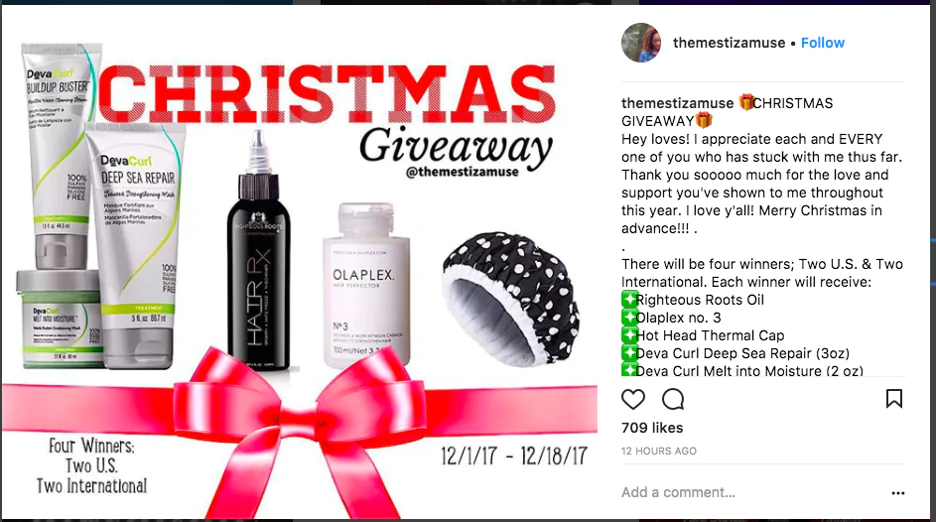 Par exemple, consultez la campagne de cadeaux de Noël de The Mestiza Muse, dans laquelle elle promet un ensemble de ses meilleurs produits à quatre heureux gagnants qui accomplissent des tâches spécifiques. Comme les tâches sont assez faciles et que les prix sont alléchants, les marques devraient être en mesure d'attirer plusieurs participants.