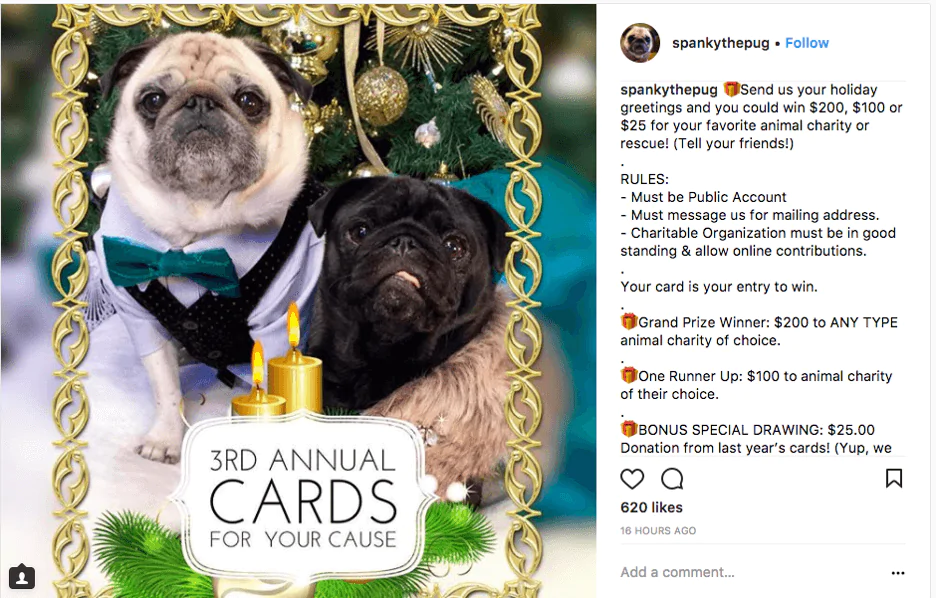 Un autre excellent exemple de cadeau hors ligne est cette campagne hébergée par Spanky the Pug, dans laquelle les utilisateurs doivent envoyer des cartes de vœux à un emplacement physique et l'heureux gagnant pourrait gagner un prix en argent pour faire un don à son organisme de bienfaisance ou de sauvetage préféré.