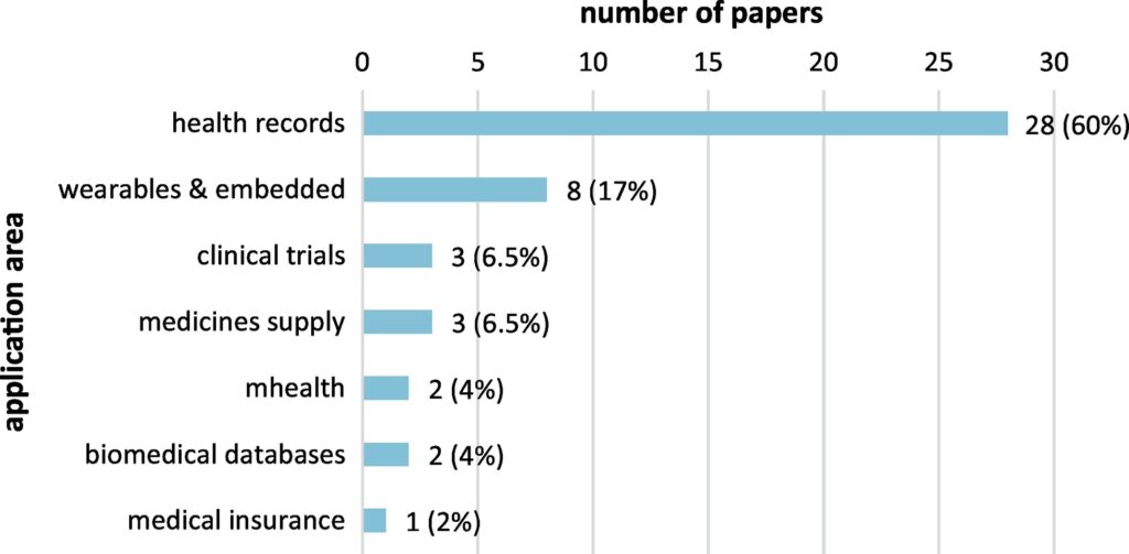 Selon une étude menée par ScienceDirect, le plus grand nombre d'articles publiés sur les applications de la blockchain dans le secteur de la santé comprenaient les dossiers médicaux (48 %), suivis des données personnelles des biocapteurs et des dossiers de santé personnels, entre autres. Le moins de recherches ont été effectuées dans le domaine des données financières ou de l'assurance médicale, qui s'élevait à 2 %.