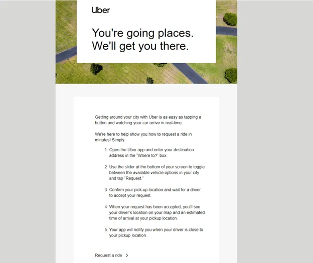 Voici un e-mail envoyé par Uber suite à l'inscription d'un utilisateur en tant que passager sur le site. Le contenu démontre la valeur de l'utilisation d'Uber, qui consiste à se déplacer facilement en appuyant simplement sur le bouton, en plus d'offrir un guide sur la façon de demander un trajet.