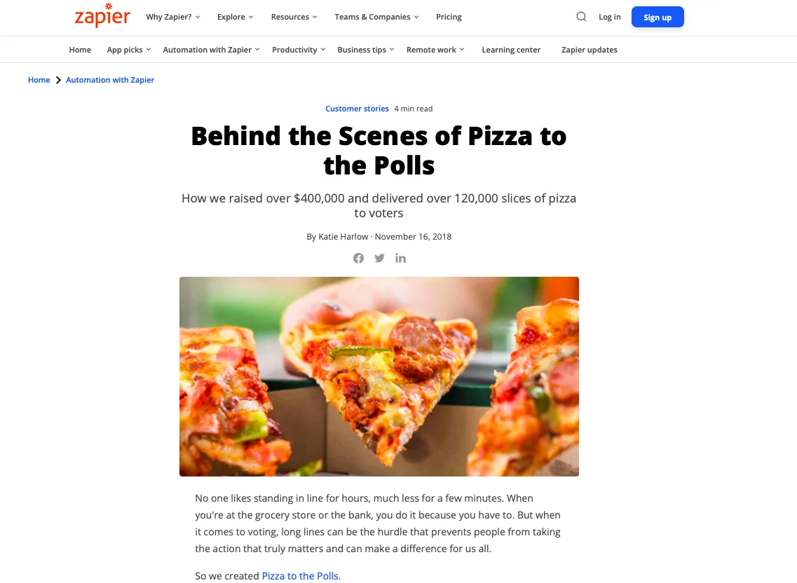 Ils ont utilisé leur outil d'automatisation d'application Zapier pour rationaliser autant que possible la logistique, le plus souvent en prenant des soumissions du site Web et en les transformant en pizzas. Ils ont écrit un cas d'utilisation solide sur la façon dont ils ont utilisé Zapier et atteint leurs objectifs !