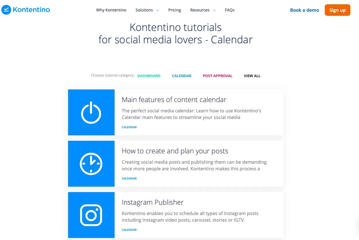 Outre la démonstration globale, les clients intéressés aiment souvent connaître en profondeur des fonctionnalités spécifiques. Créez des tutoriels informatifs sur chacune de vos fonctionnalités, que ce soit sous forme d'article de blog ou de vidéo animée. Vous pouvez également les concevoir comme des cours qui guident votre client à travers des applications réelles de chaque fonctionnalité - exactement comme le fait le concepteur de flux de travail des médias sociaux Kontentino .
