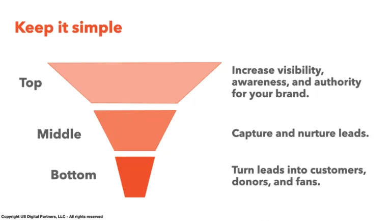 La partie inférieure est la plus étroite, convergeant vers une vente. Il s'agit de vos prospects qualifiés - des personnes qui souhaitent obtenir des solutions aux problèmes que vous abordez et qui ont visité votre site Web / se sont inscrites à vos e-mails / se sont abonnées à vos pages de médias sociaux.