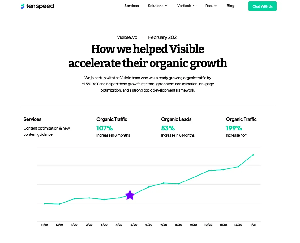 Mettez en évidence les avantages d'une manière qui montre clairement que vous êtes la meilleure réponse au problème du client. Utilisez les statistiques, les visuels et les témoignages de clients à votre avantage. Ten Speed , une agence d'optimisation de contenu, démontre abondamment le problème de votre public cible et montre exactement comment leurs clients réussissent avec votre produit. Ils offrent une preuve sociale et renforcent la confiance sous la forme d'une étude de cas.