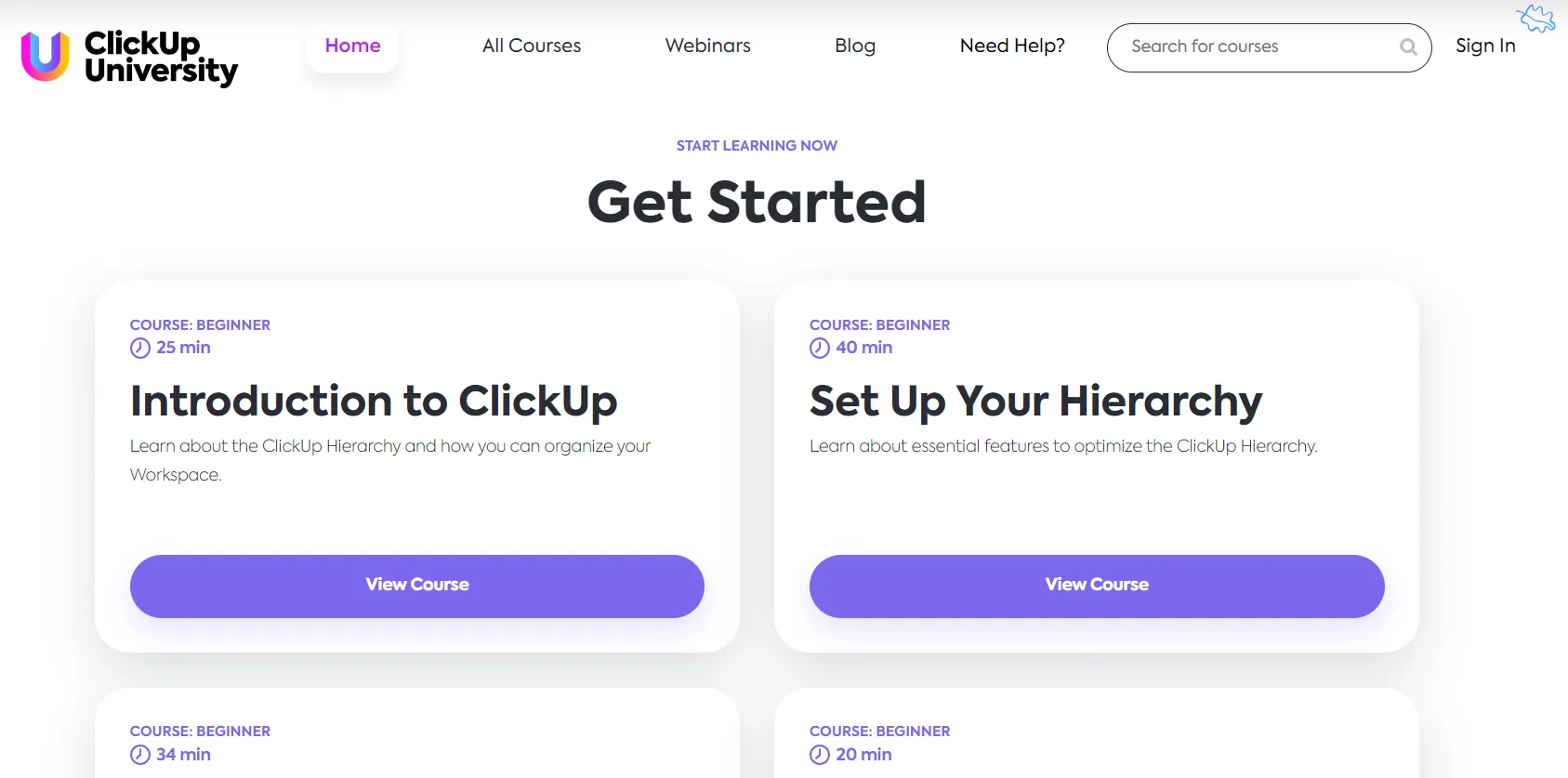 De plus, ClickUp propose des vidéos de démonstration rapides , des webinaires en direct et à la demande , des pages de comparaison approfondies des concurrents , des vidéos de cas d'utilisation et ClickUp University - un endroit pour améliorer vos compétences et votre productivité avec des cours en ligne de petite taille.