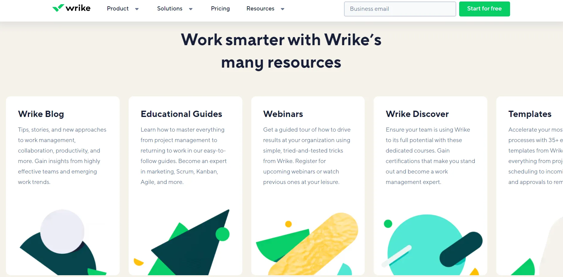 Outre les articles de blog, vous trouverez des rapports originaux, des études de cas, des infographies, des livres électroniques sécurisés (qui aident à créer leur liste de diffusion), des vidéos, des webinaires et des enquêtes. Le portail de formation en ligne gratuit de Wrike appelé Wrike Discover propose des cours de certification qui consistent en des vidéos axées sur des concepts et des exercices pratiques guidés pour utiliser Wrike à son plein potentiel.