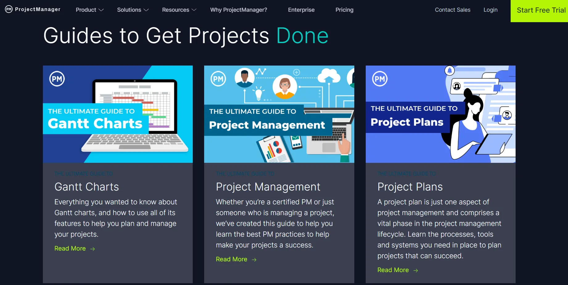 ProjectManager.com génère et convertit la majeure partie de son trafic à partir d'un blog axé sur le référencement , de pages piliers sous la forme de guides détaillés , de modèles de gestion de projet gratuits et de vidéos de produits pour démontrer ses différents cas d'utilisation.