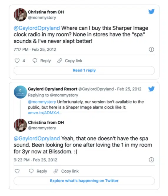 Le Gaylord Opryland a fait savoir à Christina que l'horloge de l'hôtel n'était pas accessible au public, mais lorsqu'elle est retournée dans sa chambre, elle a découvert une deuxième horloge ainsi qu'une lettre qui lui était adressée, la remerciant de les avoir suivies sur Twitter et d'avoir séjourné au Hôtel.