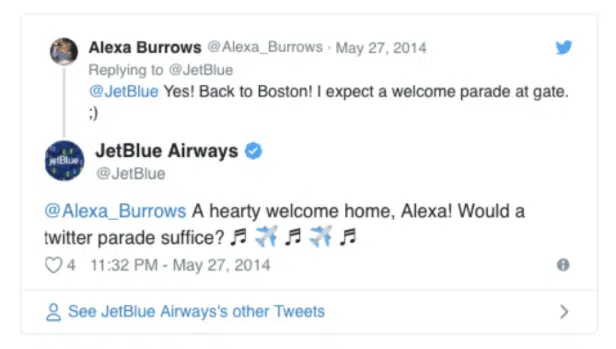 Les voyages en avion ne sont pas toujours une expérience agréable, mais l'équipe Twitter de Jet Blue en a profité pour ravir sa cliente Alexa Burrows.