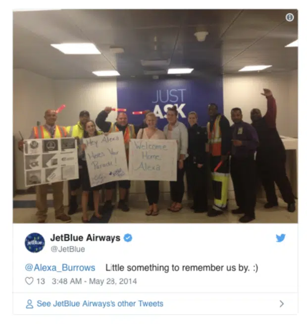 Cet acte de service extraordinaire n'a pas coûté grand-chose à Jet Blue, si ce n'est quelques fournitures de bureau et quelques instants du temps des membres du personnel. Mais vous pouvez être certain qu'Alexa (et tous ceux qui l'ont vu en ligne) s'en souviendront pendant très longtemps.