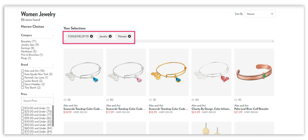 Vous savez sans doute comment mettre en avant ces produits sur votre page d'accueil. Mais en ce qui concerne les pages de catégorie, vous pouvez le faire en ajoutant un attribut de filtrage approprié à des éléments spécifiques. Pour le démontrer, un détaillant de mode en ligne 6pm.com a ajouté un nouveau groupe de filtrage #FUNJEWELRY19 aux produits d'une nouvelle collection et a appliqué ce filtre par défaut sur une page de catégorie. Ainsi, lorsqu'un nouveau client visite le site Web, les nouveaux produits attirent son attention en premier.