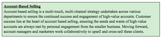 De manière générale, les grandes entreprises ont tendance à ne pas trop magasiner. Ils préfèrent traiter avec des clients en qui ils ont confiance et qu'ils connaissent sur le long terme, plutôt que de s'engager constamment dans des négociations avec différentes petites entreprises. Les grandes entreprises sont occupées. La vente basée sur le compte (ABS) est un moyen de mettre des ressources dédiées dans les grandes entreprises et de conserver ces contacts importants.
