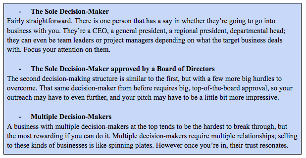 Faire ses devoirs, c'est trouver les pivots d'une entreprise et ouvrir une ligne directe avec eux. Cela signifie découvrir quels facteurs pourraient influencer le processus de prise de décision d'une entreprise et de quelles informations elle pourrait avoir besoin pour prendre cette décision , puis ajuster votre message en conséquence. Enfin, cela signifie chercher ailleurs des informations supplémentaires et une influence qui vous profite...