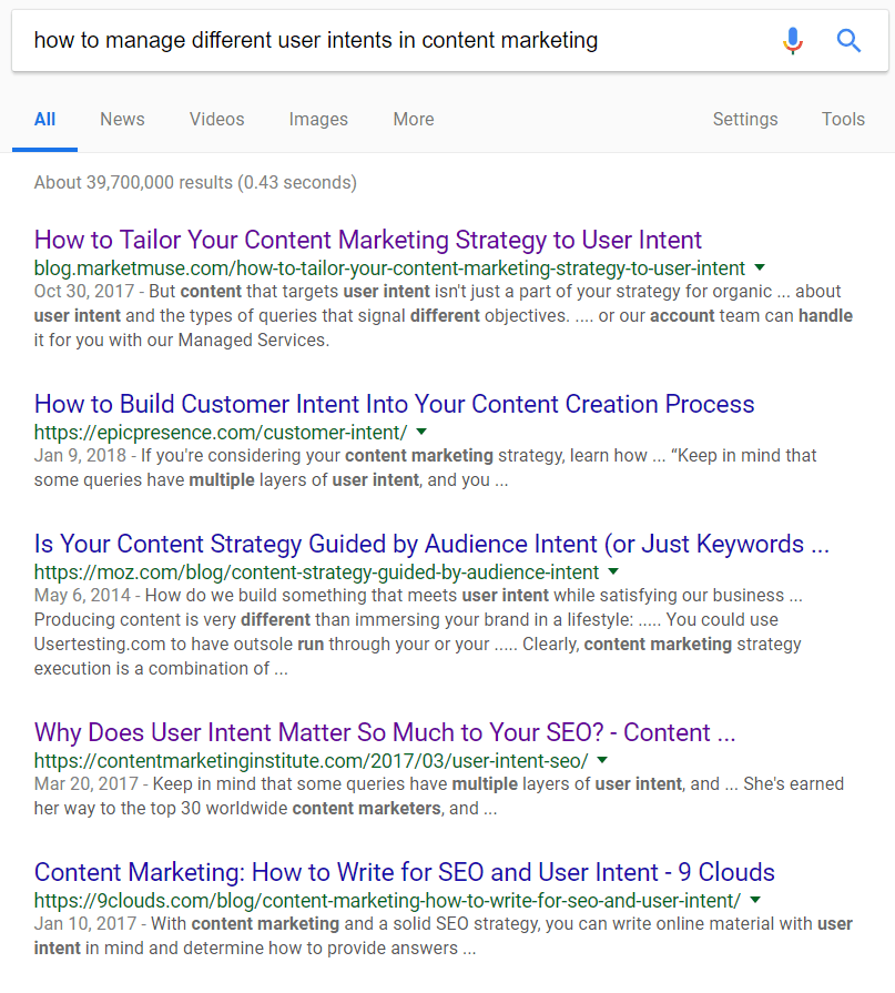 Prenons un exemple. La recherche suivante a été effectuée pour "Comment gérer les différentes intentions des utilisateurs dans le marketing de contenu".
