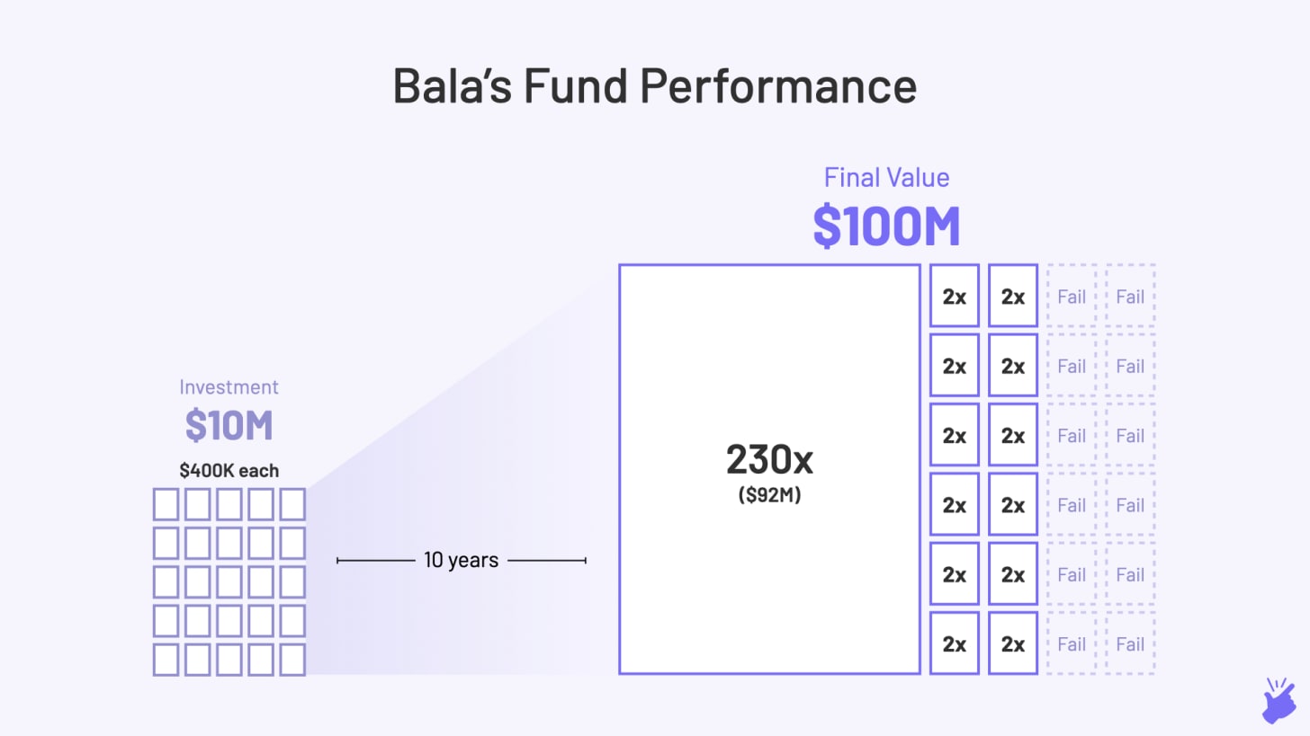 Bala a fini par lever 10 millions de dollars et a investi cet argent dans 25 entreprises. Pour générer un rendement annualisé de 25 %, le fonds de Bala doit au moins 10 x sa taille d'origine, c'est-à-dire que la somme totale de tous les investissements doit être de 100 millions de dollars (10 x sur 10 ans = 25 % de croissance d'une année sur l'autre)
