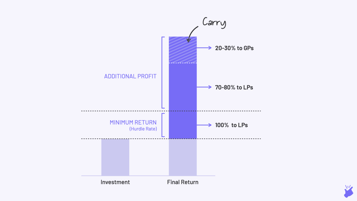 Si Fee est le salaire de base, Carry est le bonus que Bala emportera chez lui si le fonds fonctionne bien. Le profit généré par le fonds au-delà du rendement minimum promis est partagé entre les LPs (70-80%) et les GPs (20-30% en général). Il s'agit de s'assurer que Bala est incité à maximiser le rendement de son fonds. C'est le «carry» qui finira par constituer une grande partie des revenus de Bala.