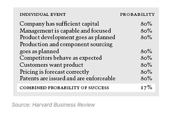Comme vous pouvez le voir sur l'image ci-dessous, même si tous les ingrédients individuels nécessaires à la création d'une entreprise prospère ont une probabilité élevée (80 %), les chances globales de réussite de l'entreprise ne sont que de 17 %. Si même un ingrédient a moins de chances de se produire (disons 50 % de probabilité), la probabilité globale que l'entreprise réussisse tombe à 10 %.