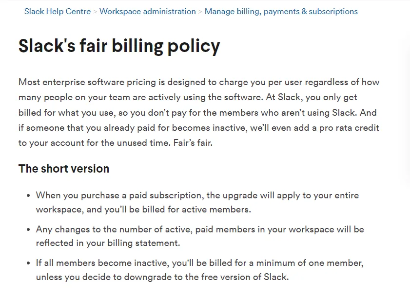 Le modèle de tarification de « facturation équitable » de Slack le rend encore plus apprécié de ses clients. Il ne facture que pour les utilisateurs actifs, et si quelqu'un arrête d'utiliser le produit pendant 14 jours, Slack vous remboursera votre argent sous forme de crédit au prorata.