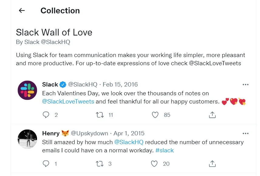 Le bouche-à-oreille littéral ne peut pas faire grand-chose. Slack a donc affiché un mur d'amour sur Twitter pour tirer parti des associations positives avec son produit et gagner plus de portée grâce aux tweets et aux retweets.