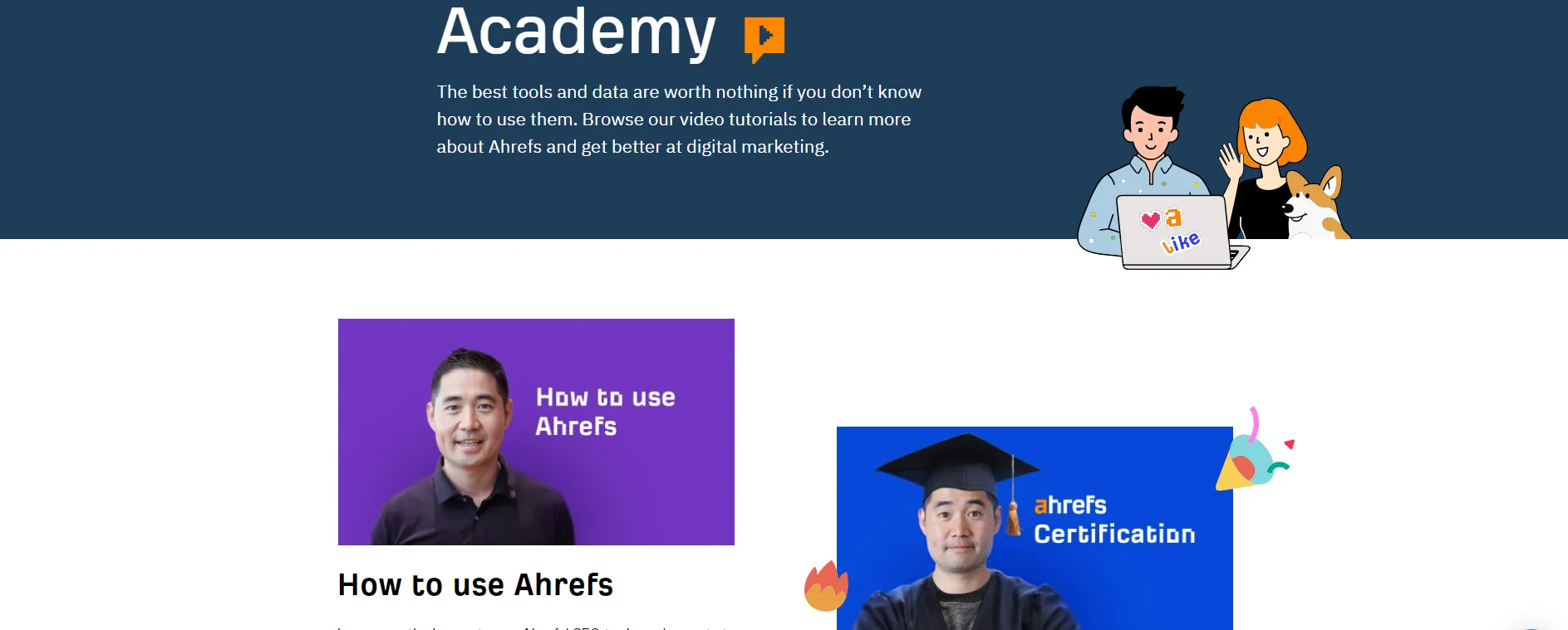 Ahrefs Academy enseigne aux gens le référencement, les blogs et le marketing numérique à travers des vidéos et des cours. Il propose également un cours de certification pour les utilisateurs d'Ahrefs qui est actuellement en version bêta.