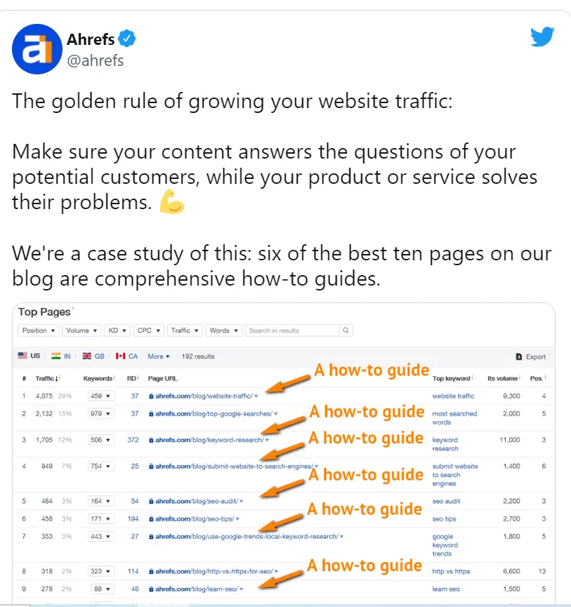Ainsi, le blog Ahrefs se concentre sur les articles de blog et les vidéos liés aux produits qui enseignent aux lecteurs comment faire du référencement avec Ahrefs.