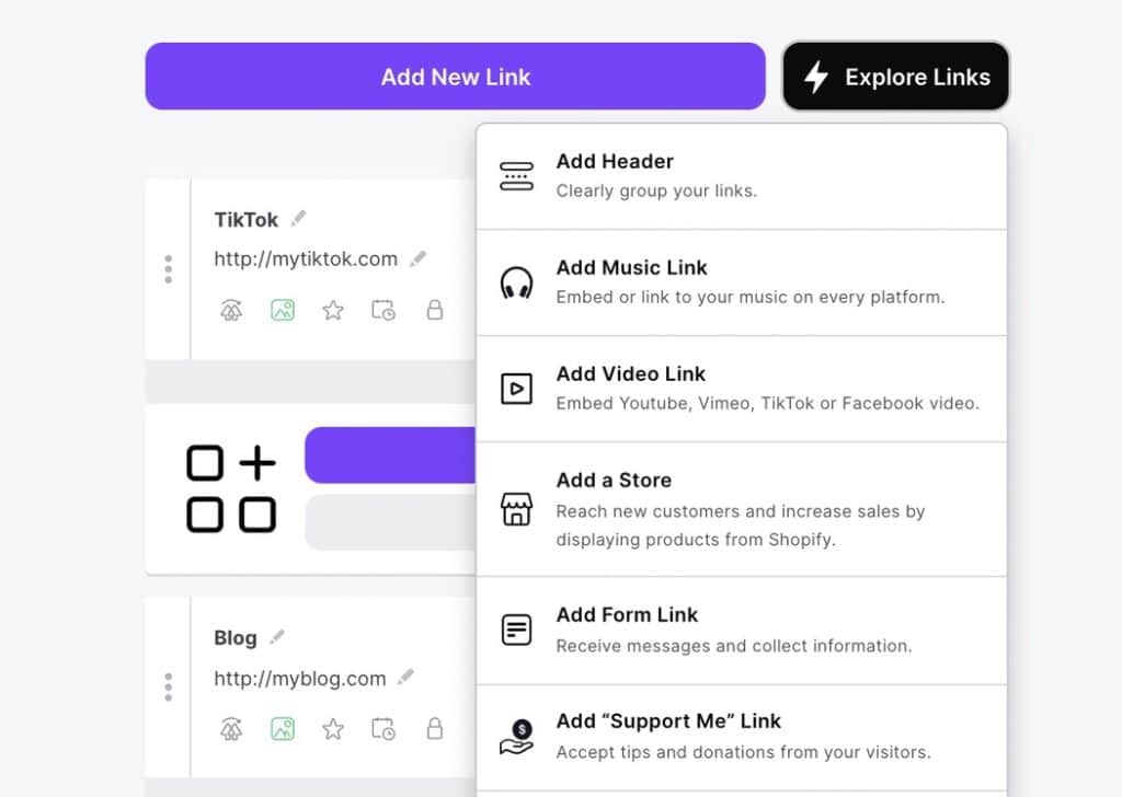 Parallèlement à cela, vous disposez d'options plus standard qui vous permettent de lier de la musique, des vidéos et un magasin à votre Linktree.