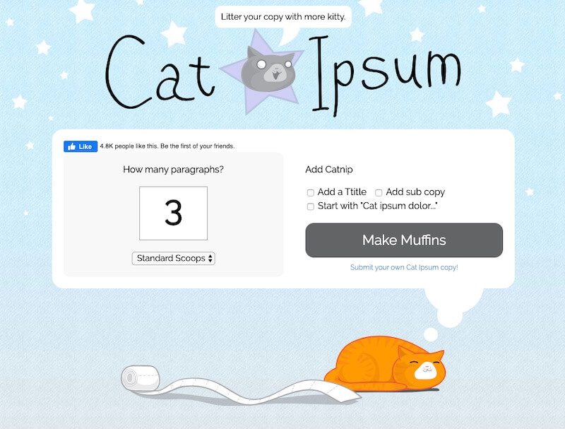 Idéal pour les amateurs de gâteaux, n'est-ce pas. Si vous travaillez sur un design qui tourne autour du gâteau, de la nourriture, etc., c'est certainement le meilleur générateur de Lorem Ipsum, sinon aussi, il fonctionnera parfaitement.