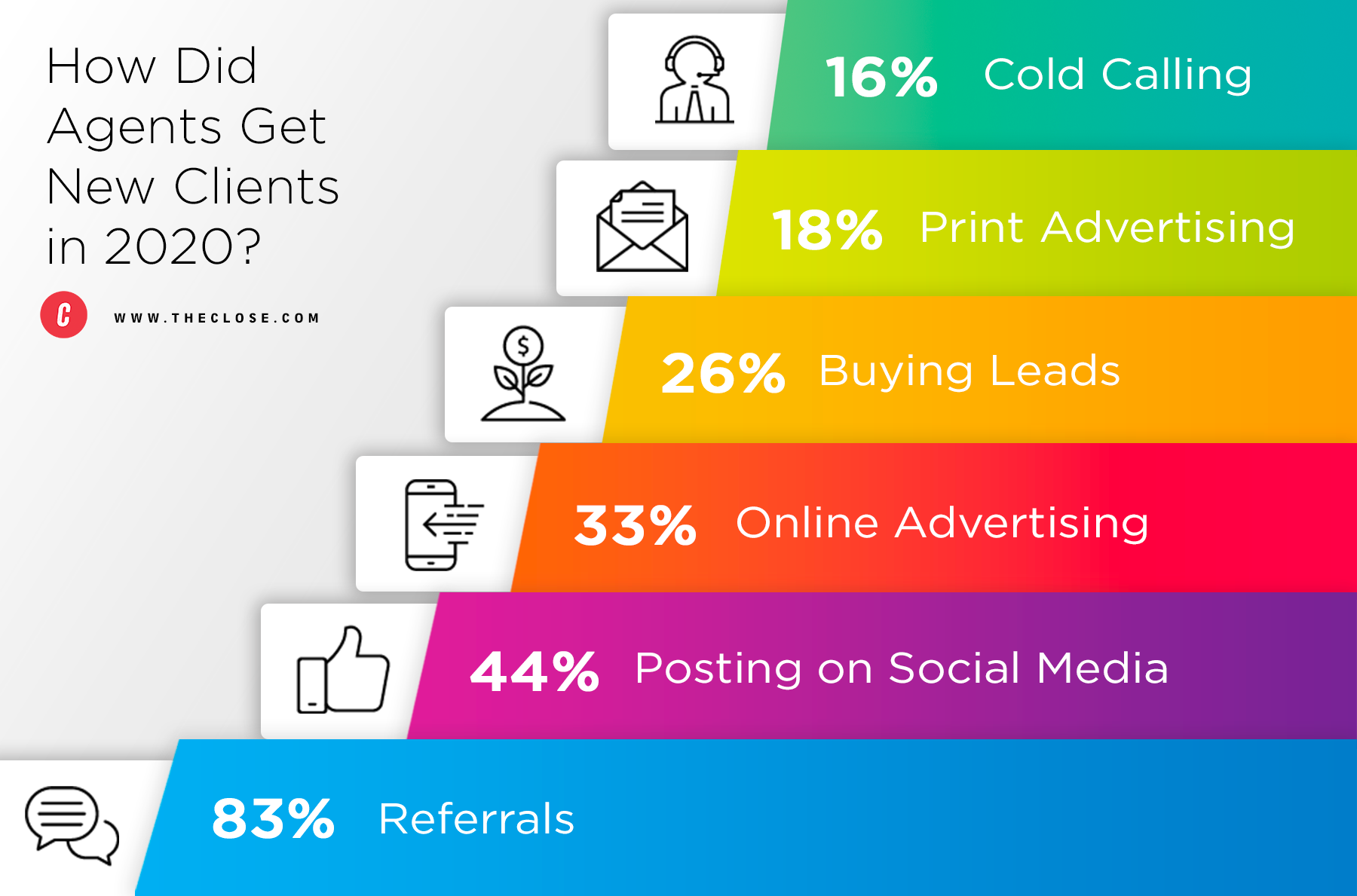 - Facilitez l'acquisition de clients avec des dépenses publicitaires parmi les plus faibles de tous les temps. Par rapport aux dépenses publicitaires hors ligne et au retour sur investissement de l'acquisition de clients, les médias sociaux changent la donne. 44% des agents conviennent qu'ils ont obtenu un client via les médias sociaux en 2020, et c'était le deuxième modèle le plus populaire après les références.