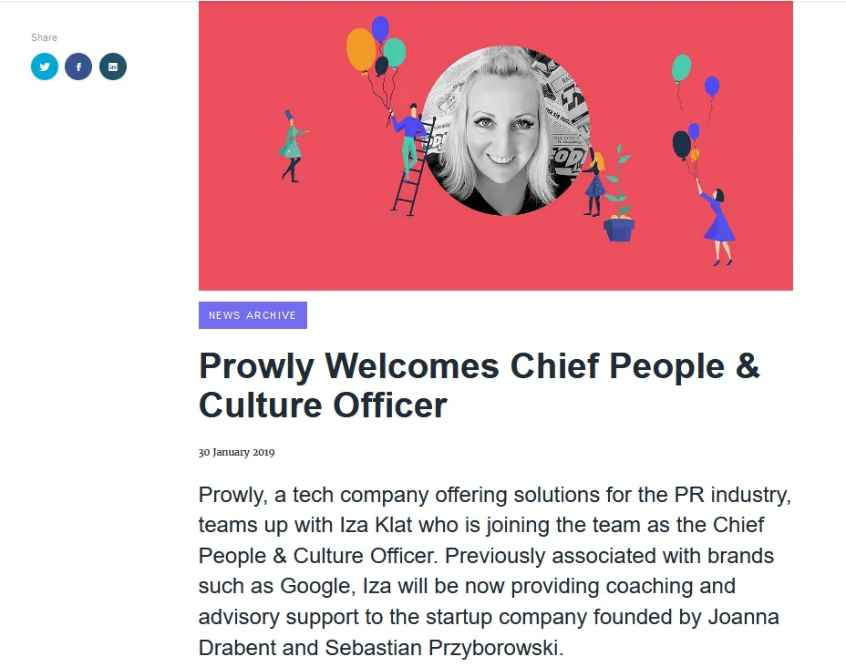Consultez le communiqué de presse de Prowly , y compris des informations sur la nouvelle recrue ainsi qu'une description de l'entreprise, des visuels attrayants et des devis.