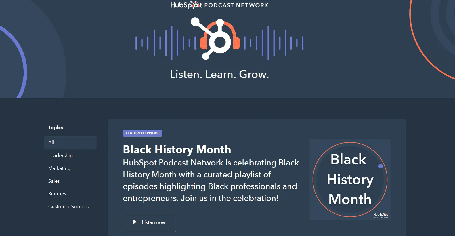 Prenez HubSpot Podcast Network , par exemple. Il aborde de nombreux sujets allant du marketing, des ventes et du leadership au succès des clients et aux startups.