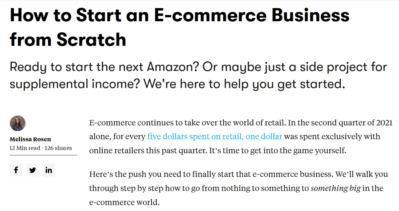 Consultez le billet de blog de Groove créé pour le haut de l'étape de l'entonnoir. Remarquez comment il fournit des informations sur le démarrage d'une entreprise de commerce électronique plutôt que sur la promotion de son produit.