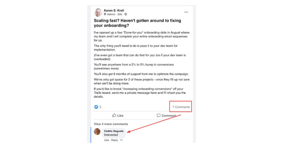 Saat anggota grup dihangatkan dengan konten yang berharga dan interaksi yang bermakna, sematkan postingan ke atas atau luncurkan pengumuman. Grup Facebook Anda akan memberi Anda audiens yang sangat bertarget tempat Anda dapat mempresentasikan penawaran Anda. Namun, cobalah untuk tidak terlalu berisi spam dan pastikan proposal Anda memberikan nilai bagi anggota grup Anda. Berikut adalah contoh penawaran reguler dalam satu grup Facebook pribadi. Seperti yang Anda lihat, posting ini telah membawa beberapa petunjuk panas ke pemilik grup.