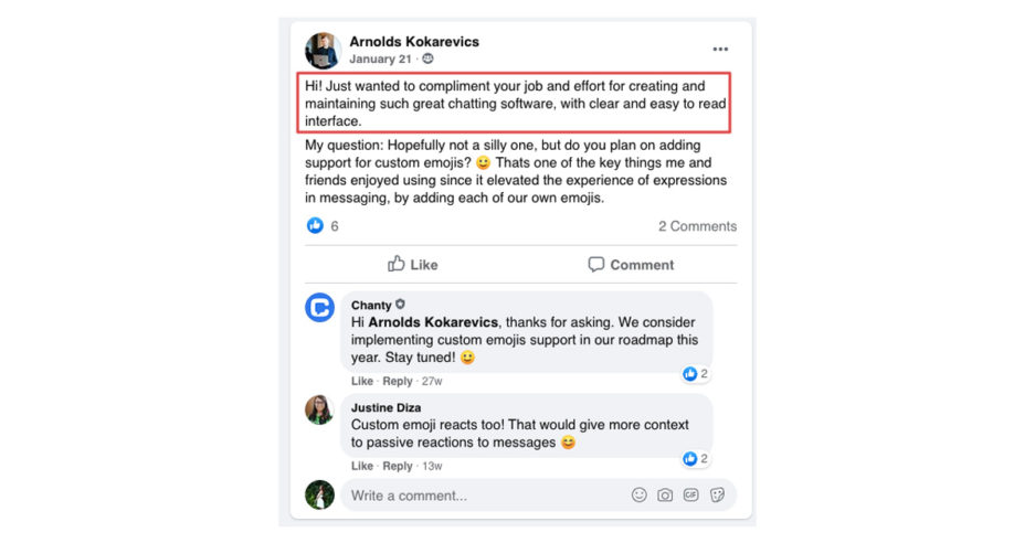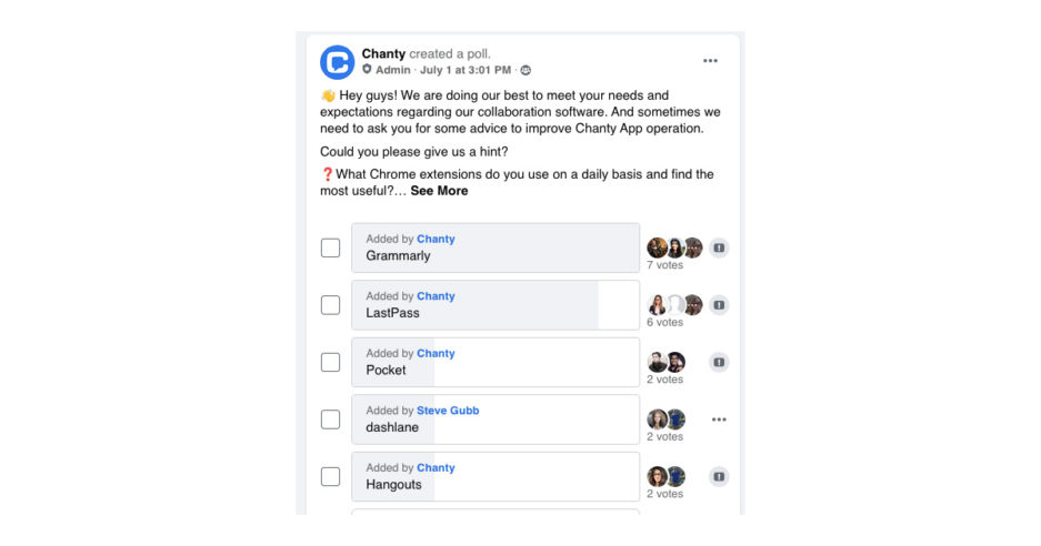 Di Chanty, penggemar kami membantu kami membentuk peta produk kami. Kami memberi tahu grup kami tentang ide untuk fitur atau pembaruan produk dan mengumpulkan umpan balik mereka. Berikut adalah salah satu jajak pendapat reguler yang kami lakukan di komunitas Chanty di Facebook: