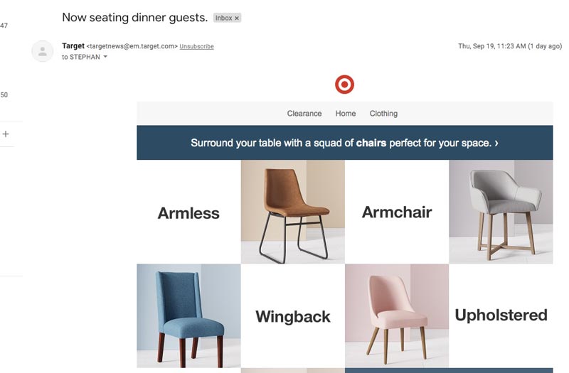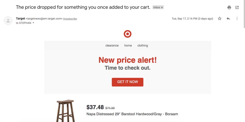 Yang penting, tidak satu pun dari ini yang secara khusus merupakan email pengabaian keranjang. Alih-alih, tampaknya Target menekan email pengabaian keranjang yang dipicu saat mereka mengirim membangun hubungan dengan klien baru.