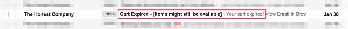 Baris subjek teriakan produk memanfaatkan ini sepenuhnya. Mereka to the point, dan memunculkan kembali keinginan atau kebutuhan yang semula dimiliki pelanggan ketika mereka menempatkan produk di keranjang mereka.