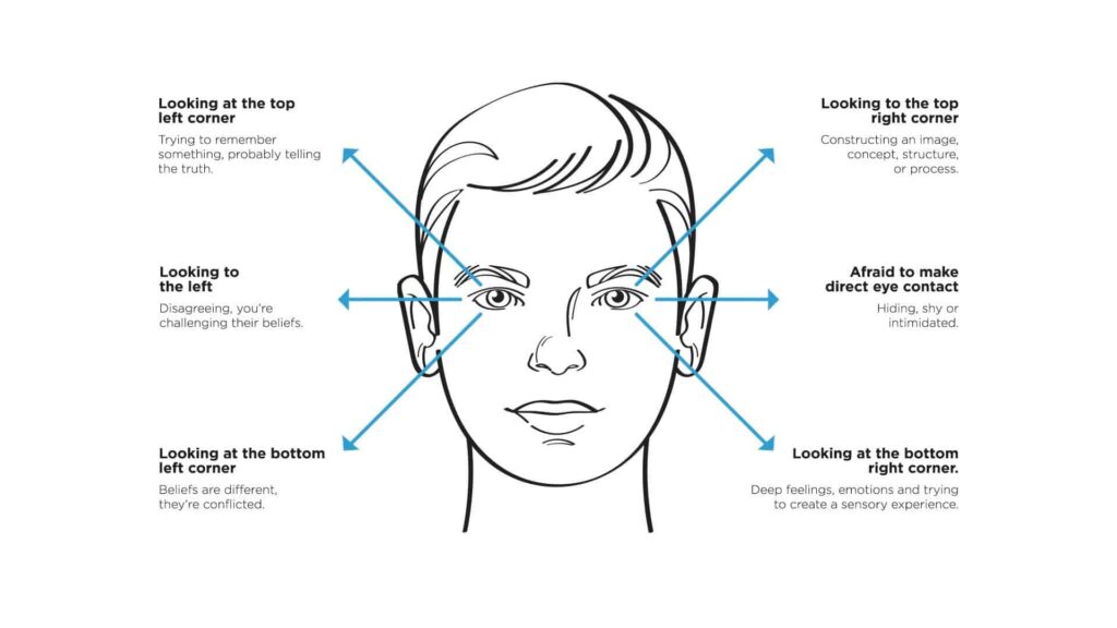 Mari kita mulai dengan bagian tubuh yang merupakan pengungkap kebenaran dan kebohongan alami. Saat Anda berbicara dengan orang lain, lihat ke mana arah gerakan mata mereka. Berikut adalah contoh yang sangat sederhana.