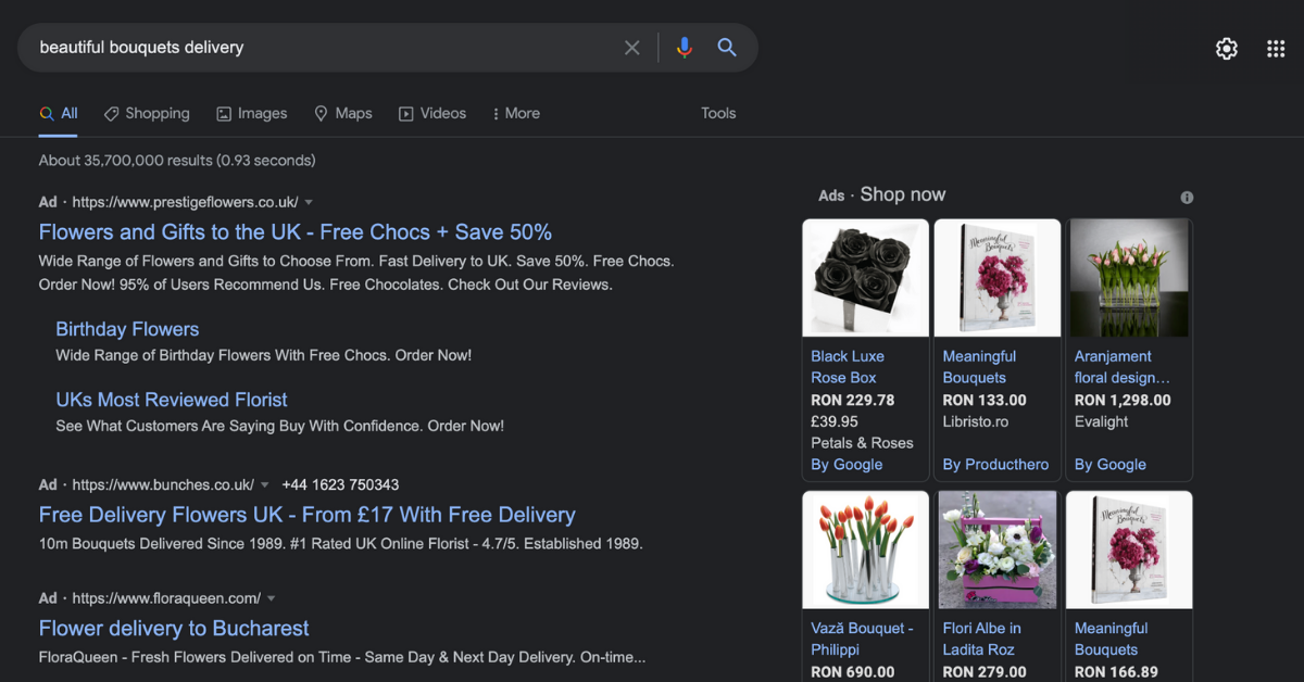 Saat mencari ide hadiah atau toko bunga, orang kemungkinan besar akan langsung membuka Google. Oleh karena itu, muncul di antara hasil pencarian teratas sangat penting untuk toko elektronik bunga dan hadiah yang ingin menarik lalu lintas ke situs web mereka. Kampanye Google sangat ideal untuk membedakan merek Anda, terutama karena lebih dari setengah dari semua klik iklan berbayar berasal dari orang-orang dengan niat tinggi untuk membeli. Untuk membuat Iklan Penelusuran Anda benar-benar efektif, gunakan judul yang menarik, seperti “karangan bunga cantik mulai dari $29” atau hemat waktu Anda dan gunakan platform otomatisasi dan mulailah menggelindingkan bola dengan konten, judul, dan kata kunci yang dibuat secara otomatis.