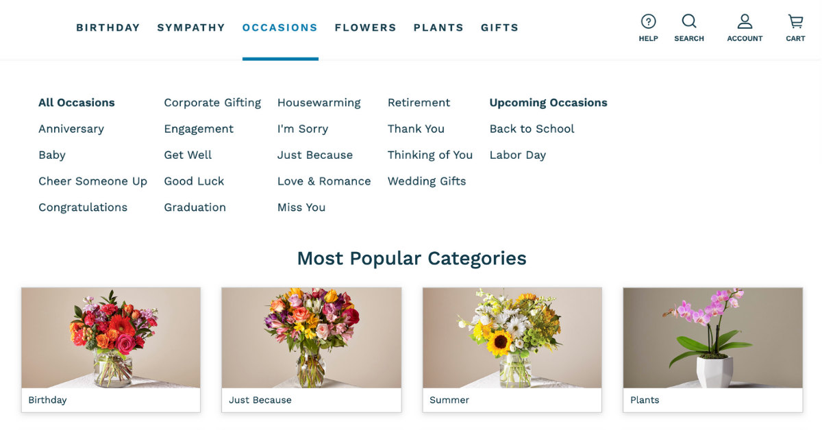Untuk meningkatkan pengalaman pengunjung di situs web Anda, Anda harus memiliki kategori produk yang mudah dinavigasi. Memungkinkan pelanggan untuk memfilter item berdasarkan kesempatan. Saat menelusuri beberapa karangan bunga pernikahan mungkin menjadi pesta untuk mata klien Anda, itu tidak akan menjadi pengalaman yang menyenangkan jika mereka membutuhkan rangkaian bunga bakung yang elegan untuk Hari Ibu dan produk itu ditempatkan di bagian bawah halaman produk Anda.