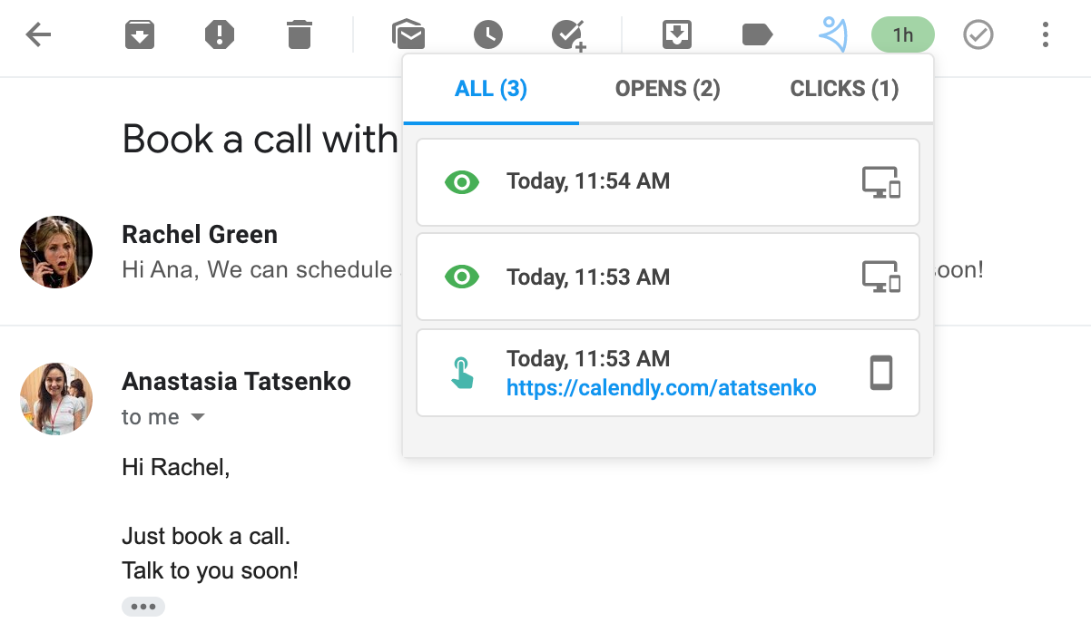 Selesai! Anda baru saja mengaktifkan pelacakan email dan sekarang dapat mengirimkan kampanye Anda ke milis. Segera setelah mereka mulai membuka email Anda, Anda akan melihat statistiknya langsung masuk. Anda dapat melihat statistiknya langsung di kotak terkirim Anda (misalnya jika Anda belum menerima balasan), dan ikon akan ditampilkan kapan email terakhir dibuka: