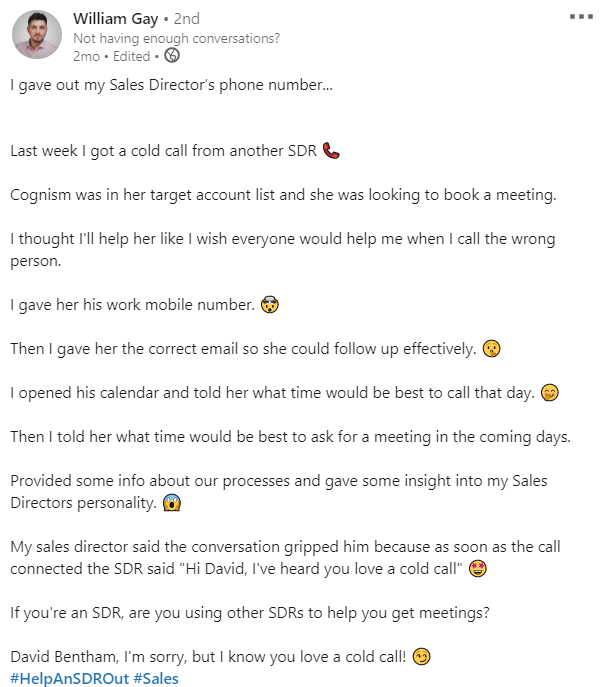 Cognism memiliki kompetisi untuk melihat siapa yang bisa mendapatkan keterlibatan paling banyak dari sebuah posting di LinkedIn. Tentu saja, posting ini menang. Mengapa? Karena menceritakan sebuah kisah yang relevan dan menggiurkan orang dengan humor. Plus, itu menunjukkan kepribadian tanpa menjadi sombong.