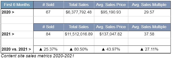 Di conseguenza, il valore dei siti di contenuti aumenterà notevolmente e vedrà una maggiore concorrenza tra gli acquirenti, proprio come è successo per le attività di Amazon FBA. Stiamo già vedendo aumentare considerevolmente il valore dei siti di contenuti, come puoi vedere nella tabella seguente: