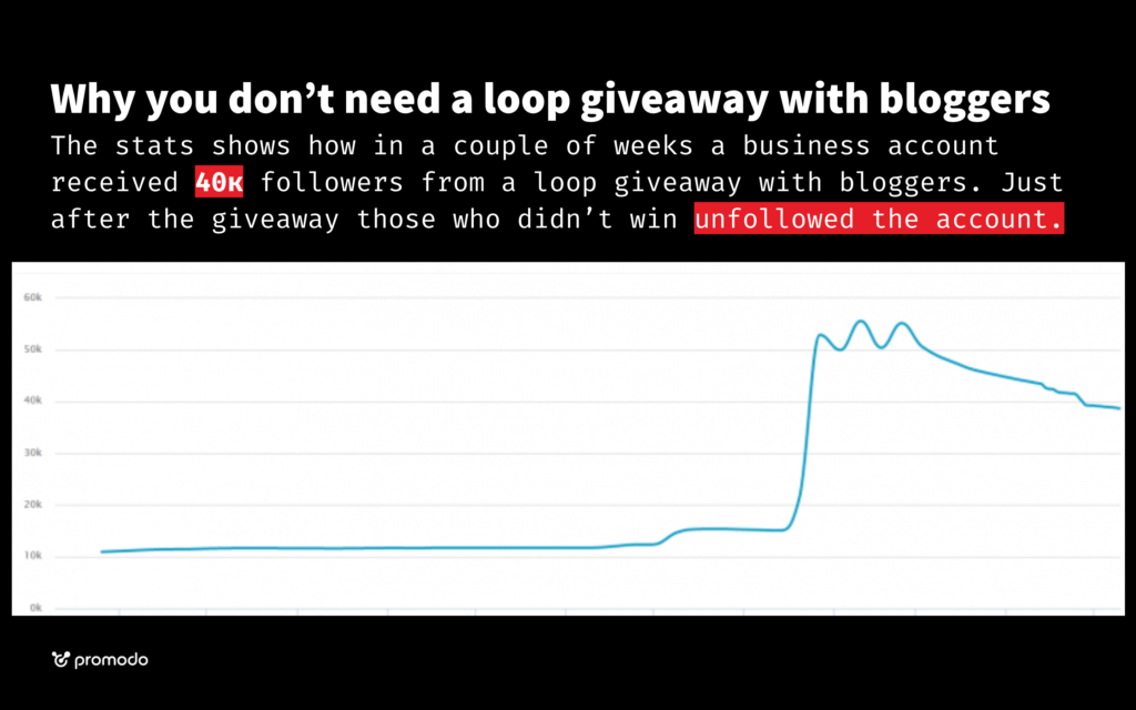 “I cacciatori di promozioni sono costantemente alla ricerca di offerte. Non apprezzeranno mai nessuno dei tuoi altri post tranne quello che include il tuo omaggio. Potrebbero continuare a seguire l'account al termine del giveaway, tuttavia, essendo inattivi per la maggior parte del tempo, ridurranno notevolmente il tuo tasso di coinvolgimento. "