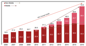 …nel grafico sopra puoi vedere che le entrate mobili sono almeno raddoppiate ogni anno dal 2010. Nel 2016 le entrate associate al traffico mobile sono cresciute a oltre il 36% rendendole responsabili di oltre il 50% di tutte le entrate pubblicitarie su Internet per la prima volta .
