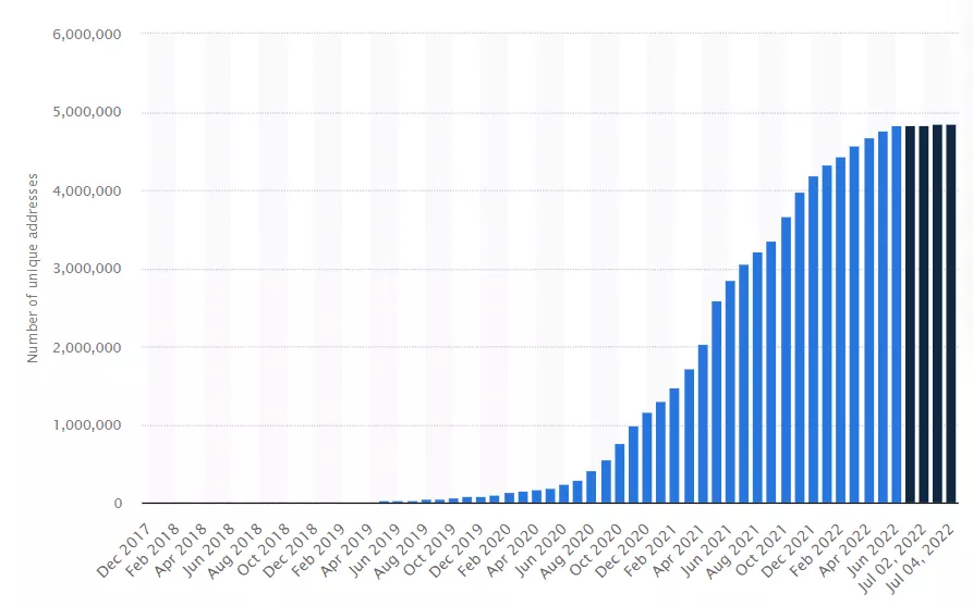 | Dimensioni del mercato o valore totale bloccato (TVL) della DeFi | Numero di utenti DeFi: misurato in indirizzi univoci | Quota di marketing di Ethereum nel mercato generale della DeFi |