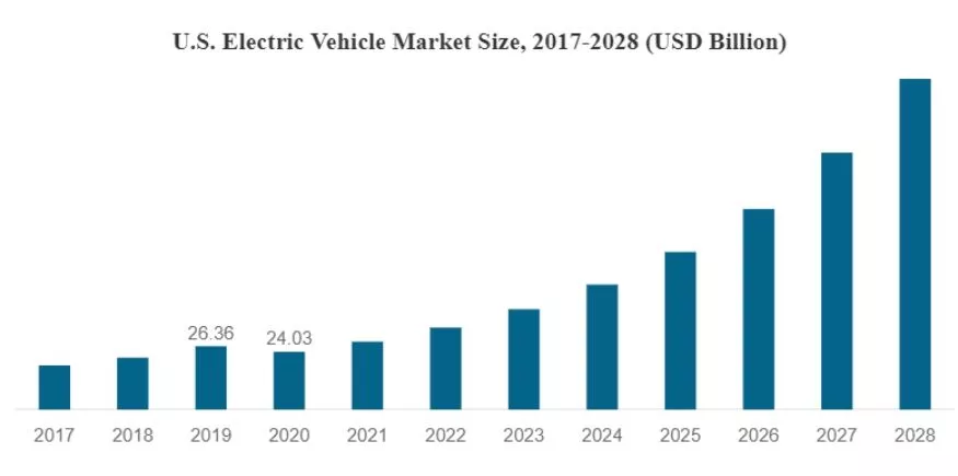 - Secondo Fortune Business Insights, il mercato statunitense dei veicoli elettrici valeva 24,03 miliardi di dollari nel 2020 e dovrebbe raggiungere i 137,43 miliardi di dollari entro il 2028 .