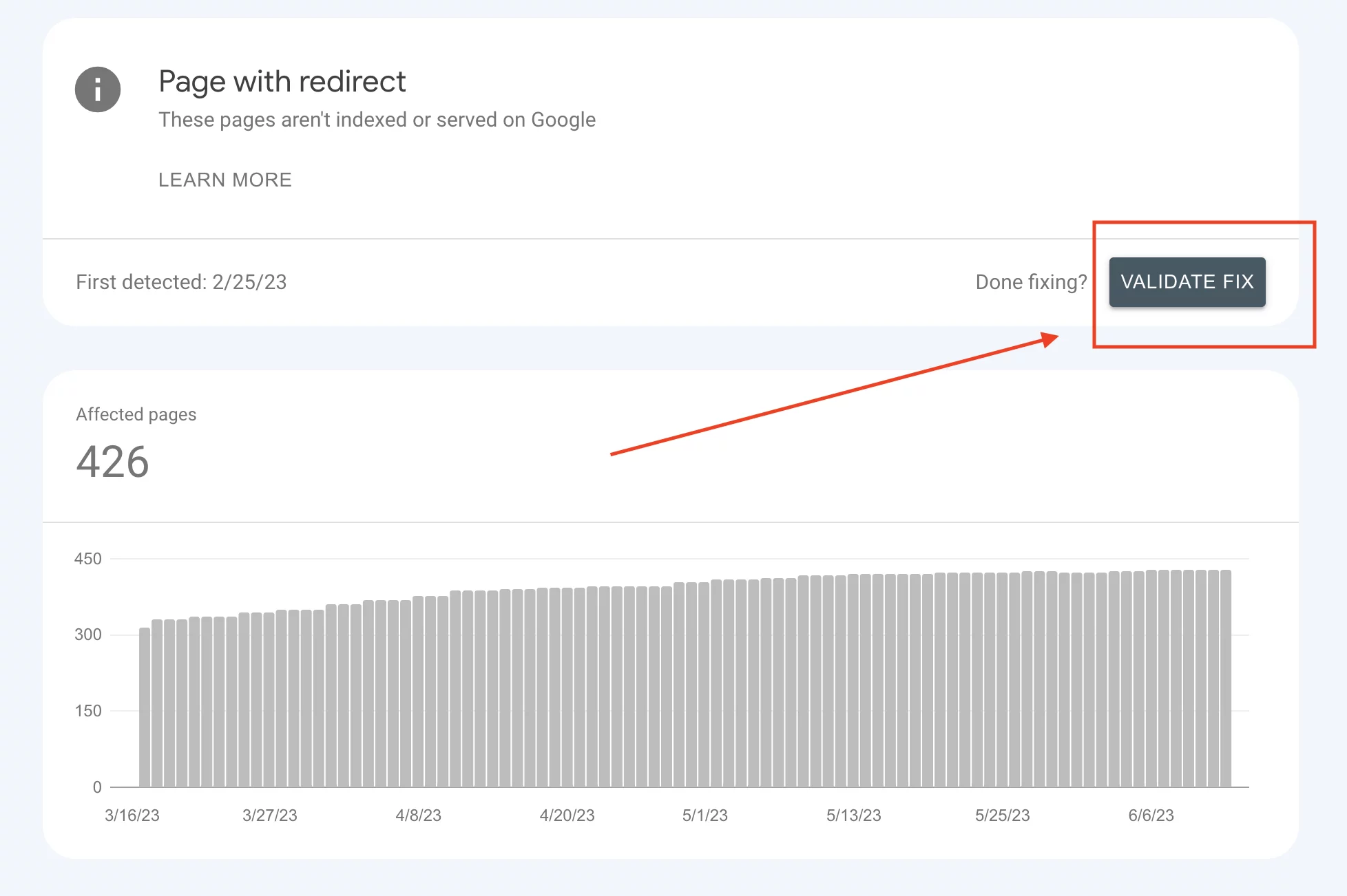 Dopo aver risolto un problema di indicizzazione, fai clic sul pulsante "convalida correzione" e Google eseguirà il processo per confermare se il problema è stato risolto o meno.